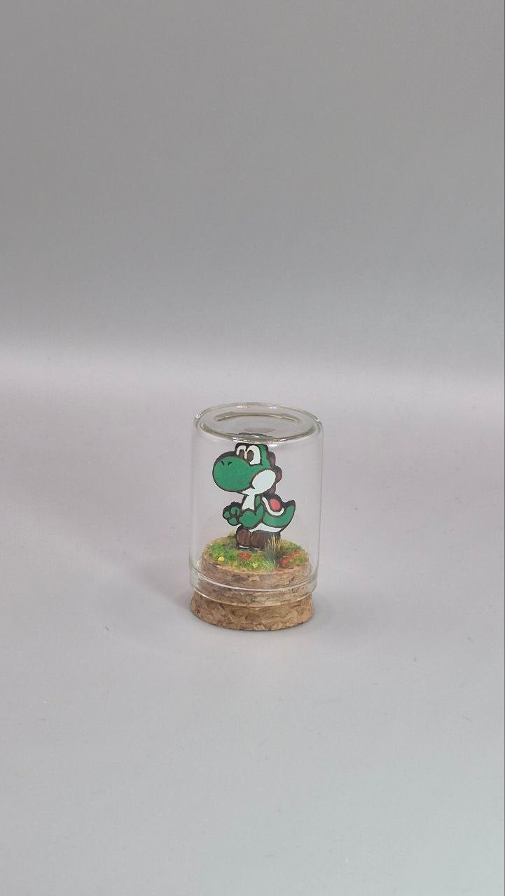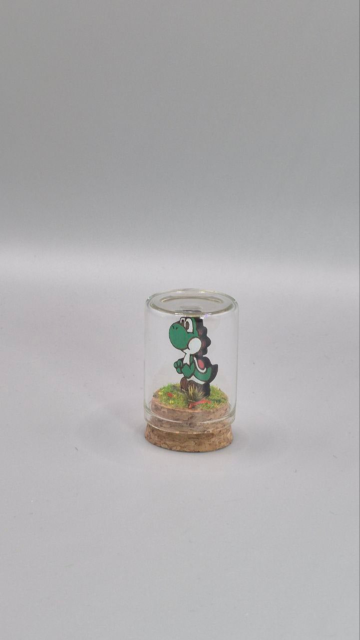 Mini terrarium Yoshi fait main, inspiré de l’univers Nintendo, idéal comme décoration geek kawaii ou cadeau pour fan de Mario et de jeux vidéo.